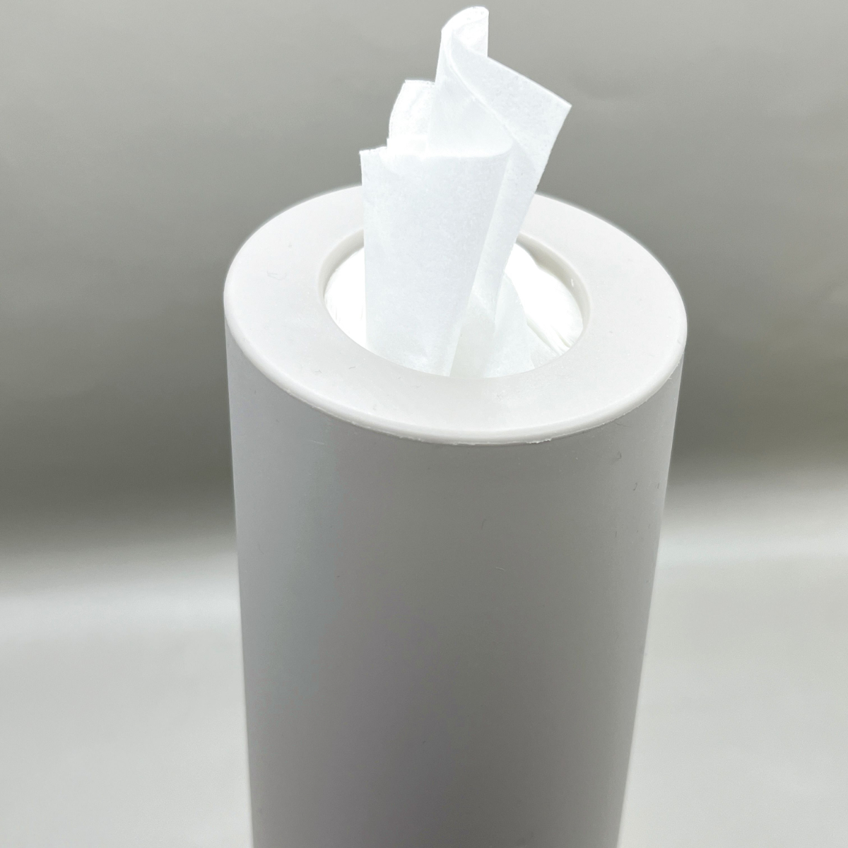 ダイソーで購入した「ティッシュボトル(グレー)」。縦にすっと伸びた筒形フォルムで、カラーは落ち着いたグレーです。