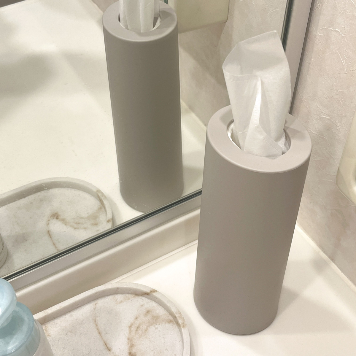 生活感が出やすい洗面台のティッシュを、スマートかつスタイリッシュに設置しておけるアイテムです。水まわりでも安心して使えて、洗面台が一気にすっきりしました。