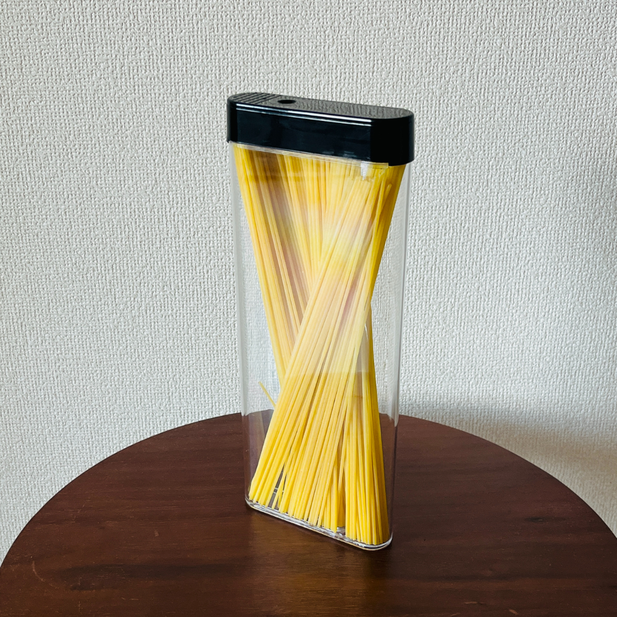 スリムな筒型デザインで省スペースに収納できるパスタストッカー