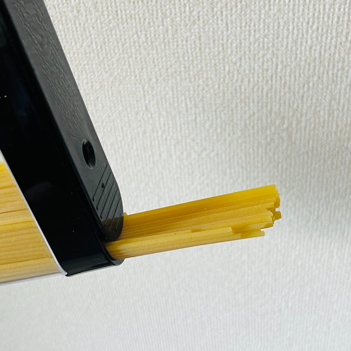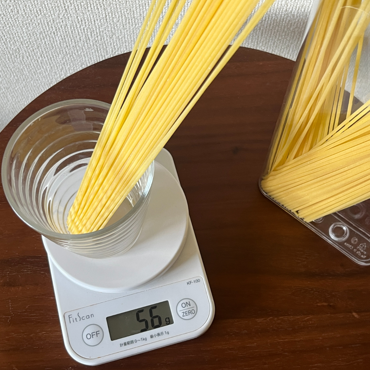 1.9mmのスパゲッティで試したところ、0.5人前が50gちょっと、1人前が100g前後となりました。毎回10g前後の誤差はありますが、わざわざ計量しなくてもいいのがラクちん♪