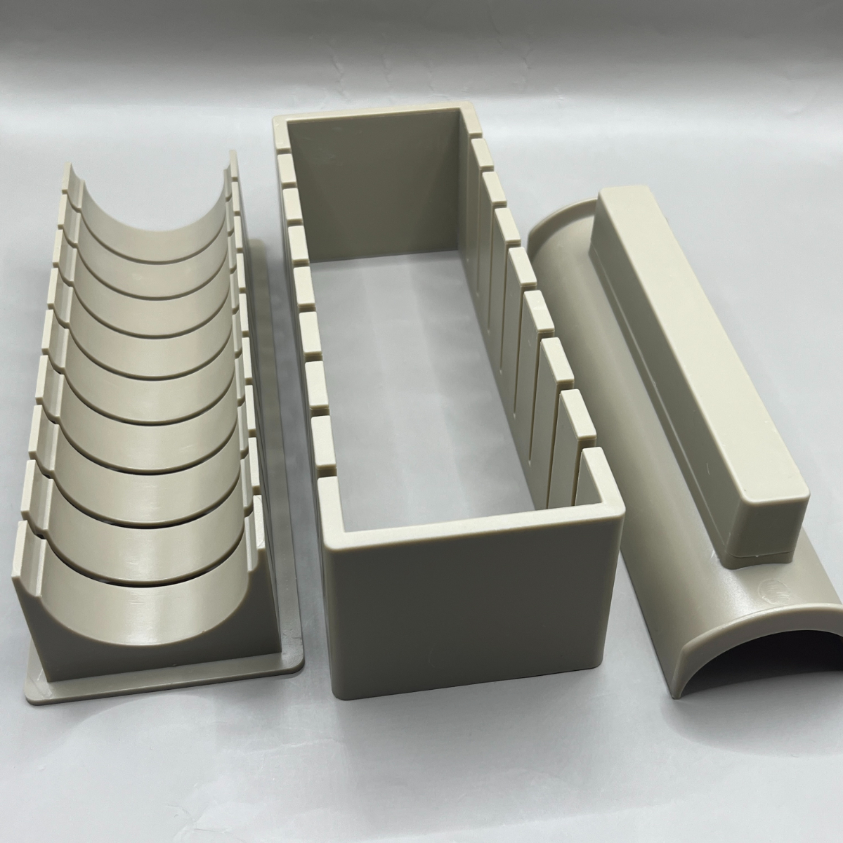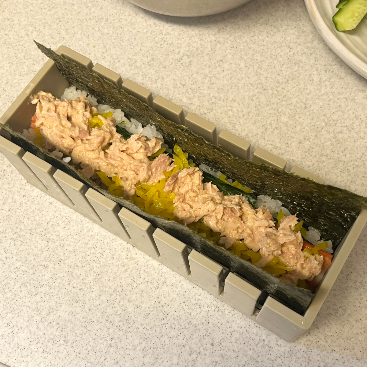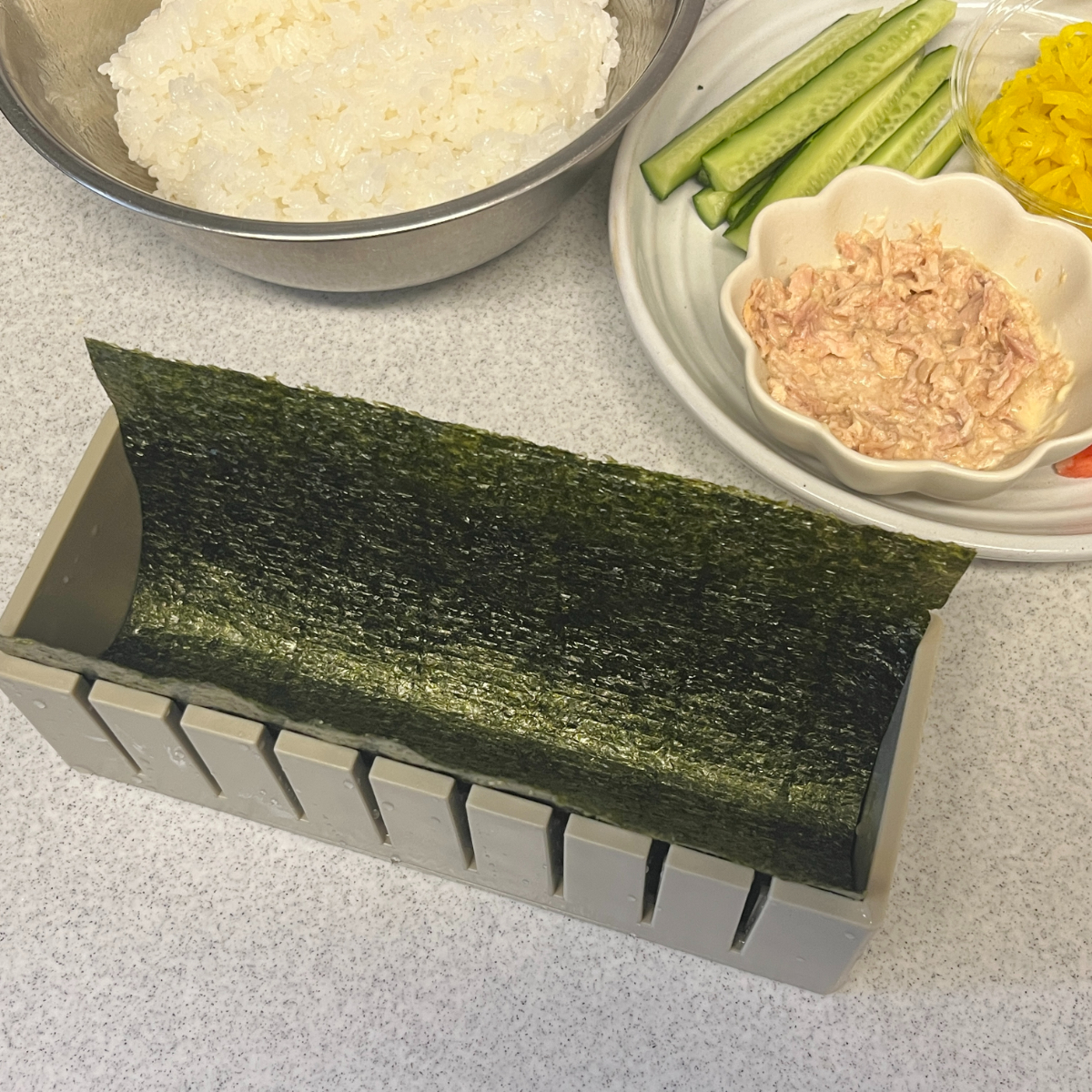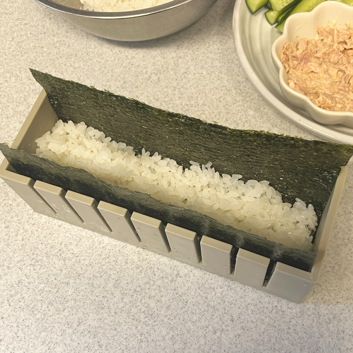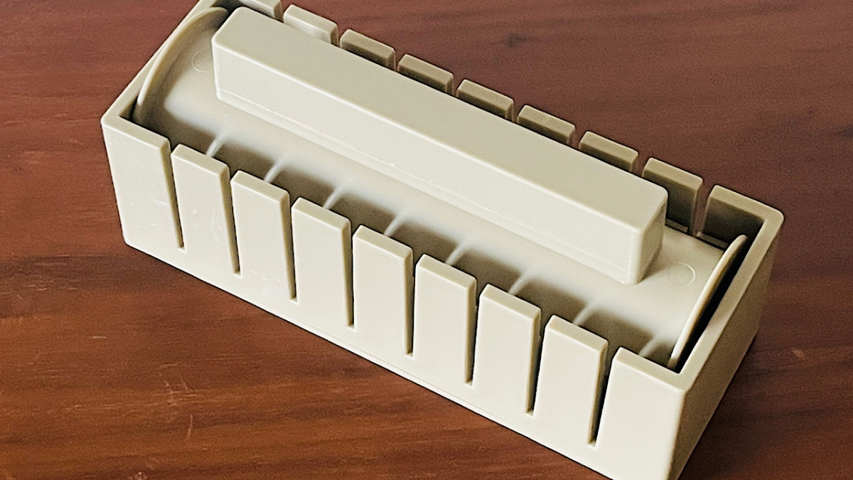 細長い型の中に海苔・酢飯・具材を順番に入れていき、最後に押しフタでぎゅっと押し固めるだけというシンプルな構造。巻きすを使わなくてもきれいに形が整うので、巻き寿司初心者でも扱いやすいのが魅力です。