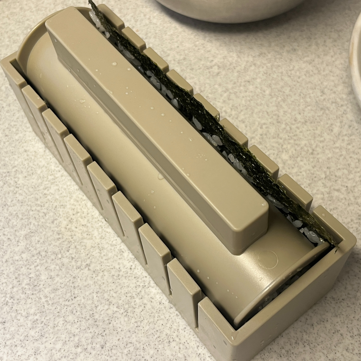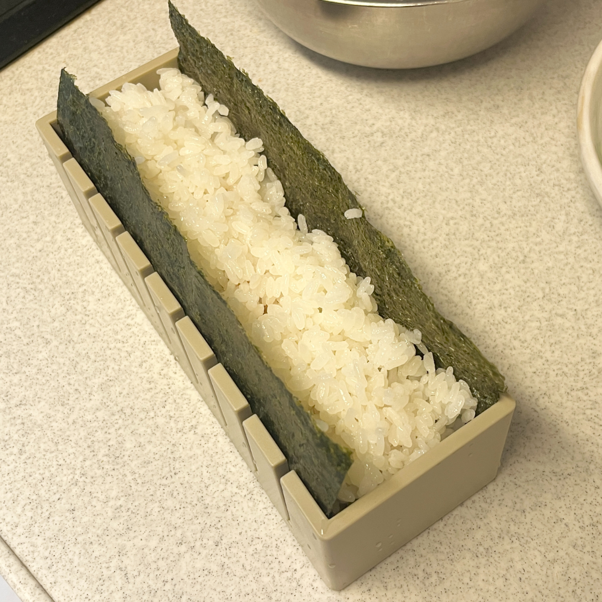 ⑤手前の海苔をかぶせて押しフタで押し込む