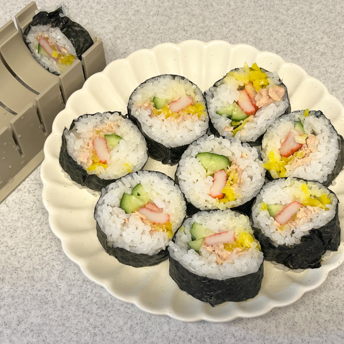 ただし少しコツもあり、酢飯や具材を詰め込みすぎると形が崩れやすくなります。また海苔が切りにくい場合もあるので、包丁を濡らしてキッチンペーパーで軽く拭きながらカットすると、断面がきれいに仕上がります。