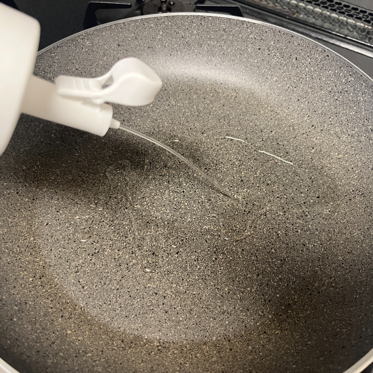 使い方はシンプルで、ボトルを軽く押すだけ。極細ノズルから細く出た油が、フライパンの上にスーッと広がります。